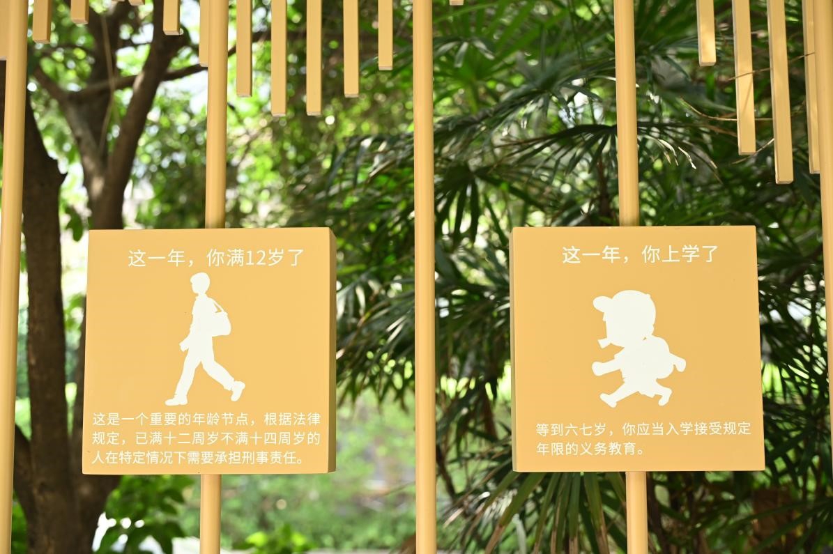 往前走几步,一面精巧的互动墙映入眼帘,十个互动式转牌富有特色。“这一年,你上学了——等到六七岁,你应当入学接受规定年限的义务教育……”只见,转牌的正面是人生各个阶段的缩写图,背面则是对应的法律法规。这面墙围绕“以法之名守护一生”的主题,生动地呈现出婴孩、婚姻、职业、晚年等人生各个阶段相应的法律法规,让行人感受法律的无处不在和温情一面,在互动中增强对法治的认同感。