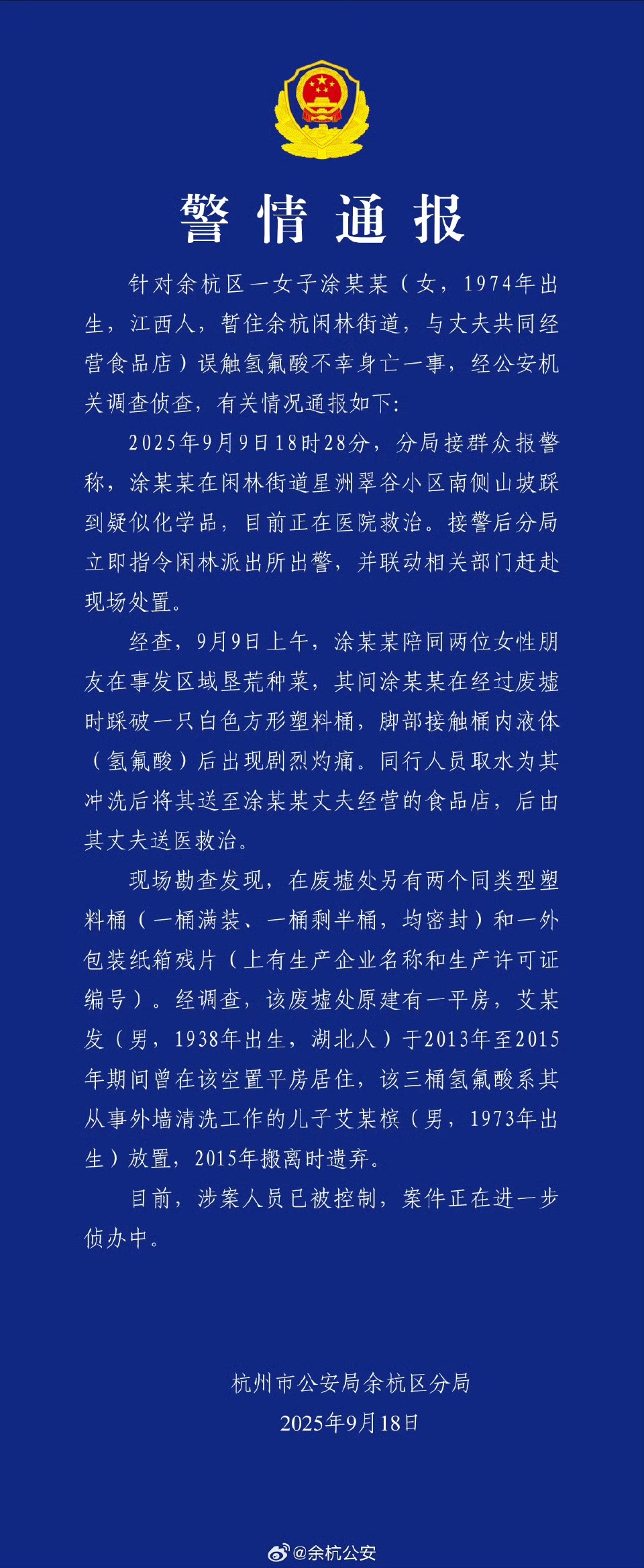 针对余杭区一女子涂某某(女,1974年出生,江西人,暂住余杭闲林街道,与丈夫共同经营食品店)误触氢氟酸不幸身亡一事,经公安机关调查侦查,有关情况通报如下: