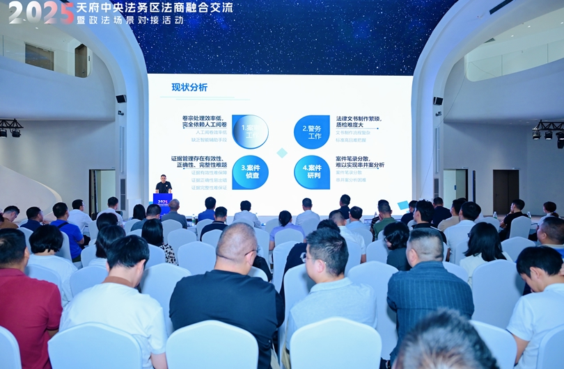 9月25日,天府中央法务区法商融合交流暨政法场景对接专场活动在成都科创生态岛成功举办。本次活动旨在深入贯彻落实成都市委市政府“进万企、解难题、优环境、促发展”决策部署,服务全市现代化产业体系建设,通过需求发布、成果展示、供需对接,推出一批具有示范效应的政法领域新场景新产品,为法务与产业深度融合、科技赋能政法工作搭建高效平台。