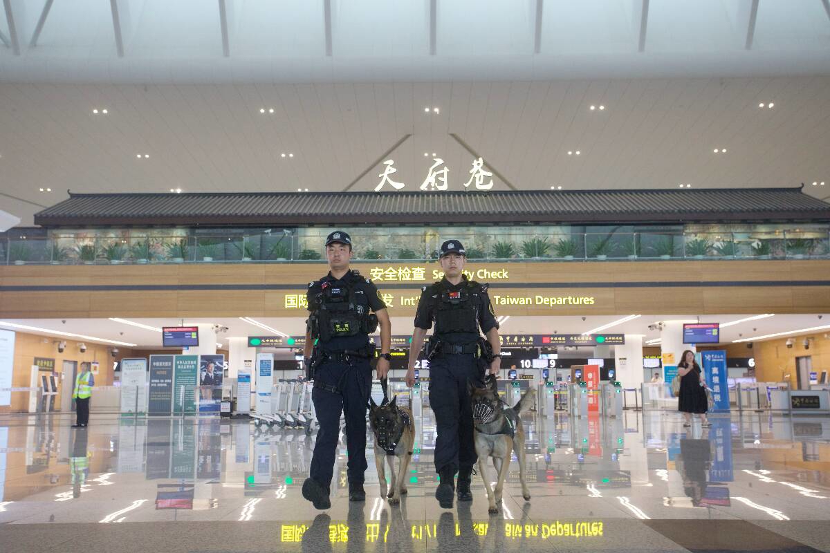 “追风,坐!”随着训导员陈林一声令下,省公安厅机场公安局特警巡警支队二大队警犬队的警犬“追风”立即端坐,一双黑亮的眼睛警惕地扫视着天府国际机场T1航站楼出发大厅的往来旅客。