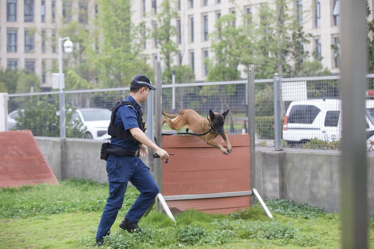 下午时段,警犬队迎来“加练时间”。“搜爆、服从科目风雨无阻。”魏晓敏带着“桑尼”在训练场奔跑,“我们不仅要练技能,更要培养信任和默契。”