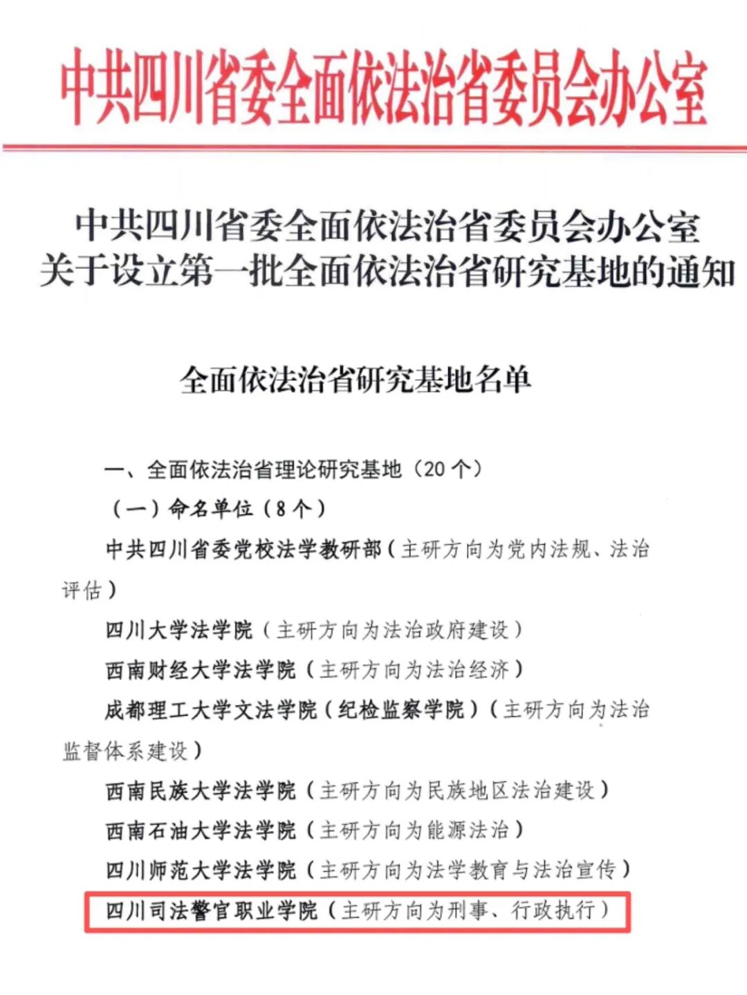 近日,中共四川省委全面依法治省委员会办公室正式印发《关于设立第一批全面依法治省研究基地的通知》,经严格评审,共评选出8个命名单位,12个培育单位。其中,四川司法警官职业学院入选首批“全面依法治省理论研究基地”命名单位,是全省唯一获此殊荣的高职院校。