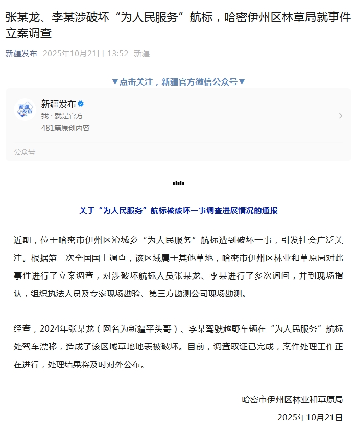 10月21日,新疆发布微信公号发布《关于“为人民服务”航标被破坏一事调查进展情况的通报》,全文如下: