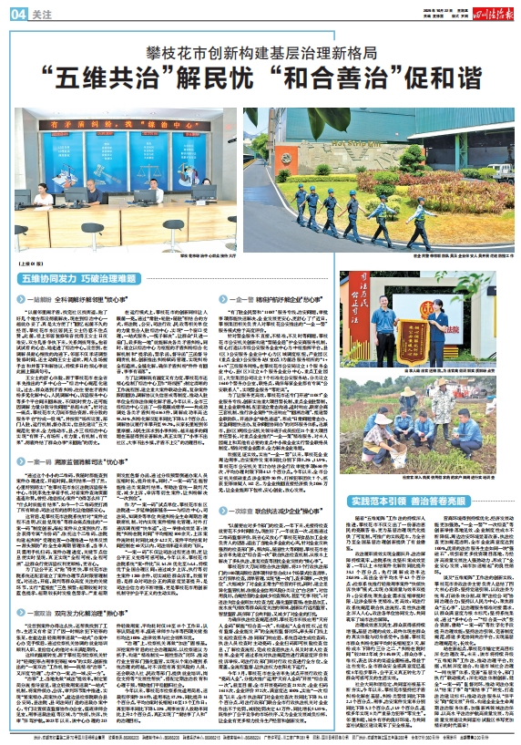 如何打破传统条块分割、分散治理的体制机制藩篱,让群众的“五心事”得到精准回应、高效解决?攀枝花市以习近平新时代中国特色社会主义思想为指引,深入贯彻落实习近平总书记关于社会治理的重要论述,将中华优秀传统文化中的和合理念与现代善治精神深度融合,创新构建“一站解纷、一案一码、一案双治、一企一警、一次综查”的“五维矩阵”工作法,走出了一条具有攀枝花特色的“和合善治”之路,为高质量发展建设共同富裕试验区注入了强劲法治动能,筑牢了坚实平安底色。