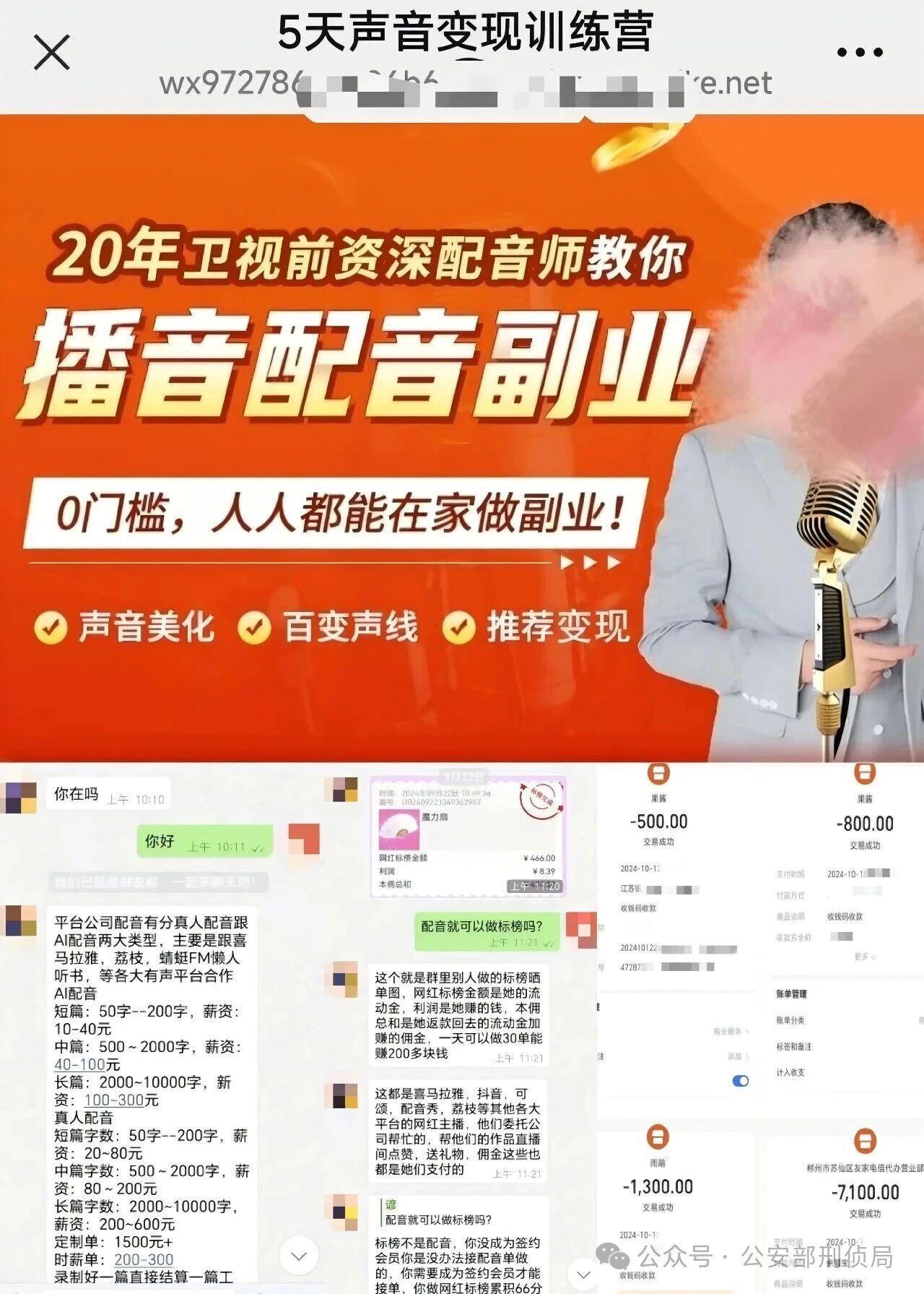 诈骗分子会在社交平台以及网络直播间中,发布投资理财课程、无门槛兼职、高薪赴境外工作等内容的视频。在获得受害人关注后,诈骗分子会在评论区或者直播弹幕中发布“想了解更多,私信联系客服”等评论,引诱受害人越过官方平台加入所谓的“投资指导群”“配音群”“兼职群”“课程群”,进而实施诈骗。这种引流手段更具有迷惑性,有些甚至会铺垫几个月的时间,当受害人放松警惕之后才实施诈骗。不要轻信社交平台中短视频发布的内容。