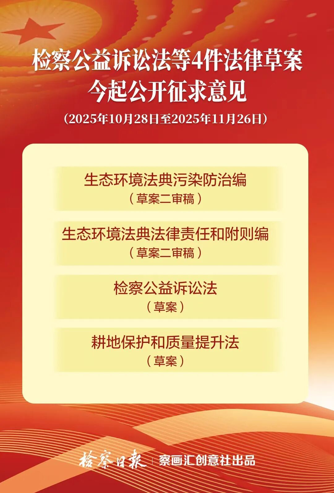 正义网北京10月28日电(检察日报记者张子璇)10月28日,全国人大常委会法制工作委员会对外公布4件法律草案,面向社会公开征求意见。其中包括生态环境法典污染防治编草案二审稿、生态环境法典法律责任和附则编草案二审稿、检察公益诉讼法草案、耕地保护和质量提升法草案。