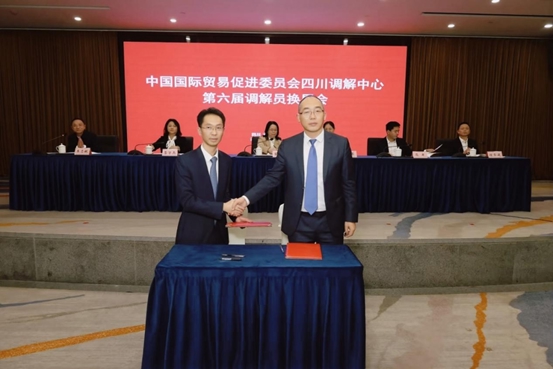 10月28日,中国国际贸易促进委员会四川调解中心第六届调解员换届会议在成都举行。四川省市有关部门领导、各地市州贸促机构负责人及新任调解员代表等80余人参会,共同见证四川商事调解事业发展的新起点。会上,四川天府一带一路商事调解中心与四川调解中心签署战略合作协议,共促国际商事纠纷多元化解。