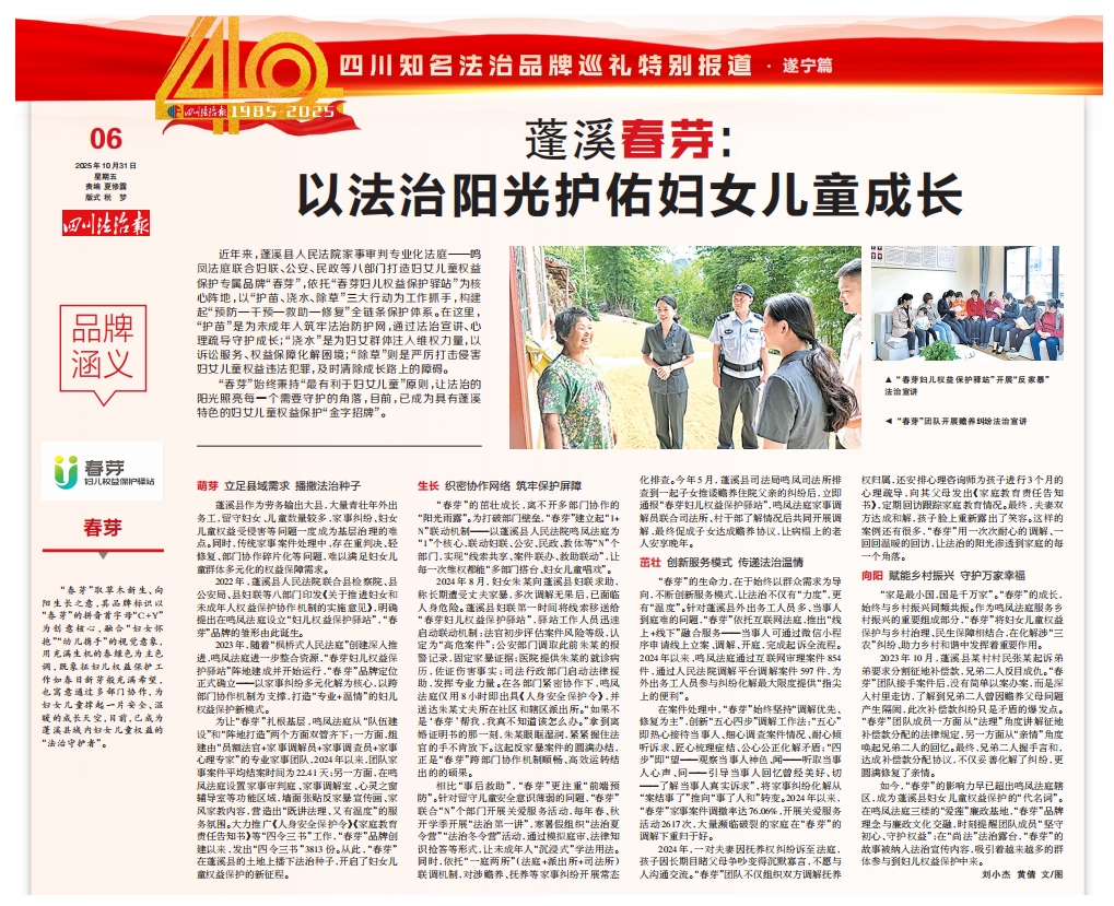 “春芽”始终秉持“最有利于妇女儿童”原则,让法治的阳光照亮每一个需要守护的角落,目前,已成为具有蓬溪特色的妇女儿童权益保护“金字招牌”。