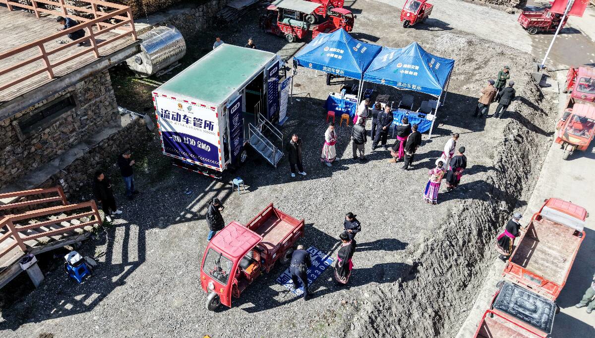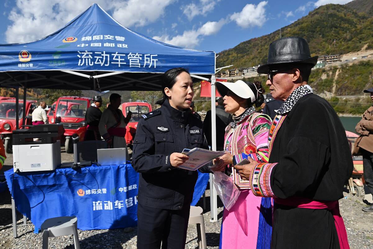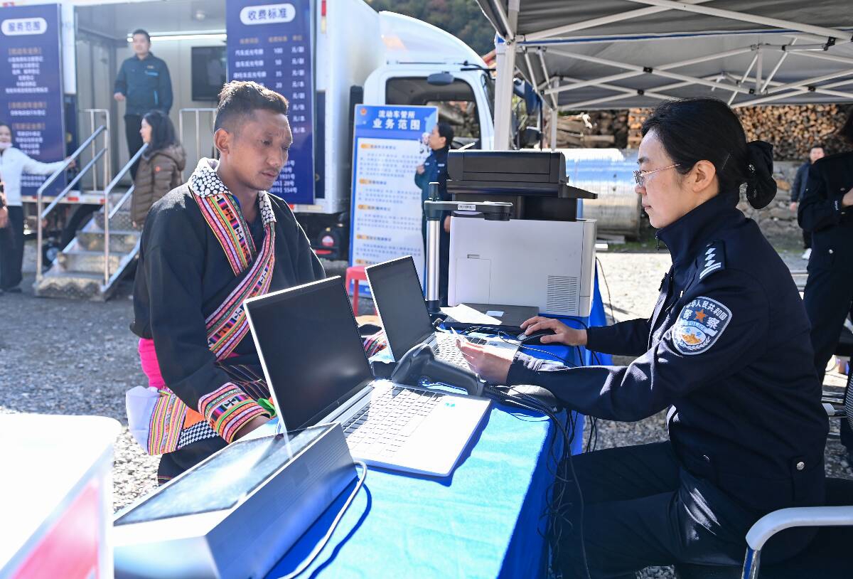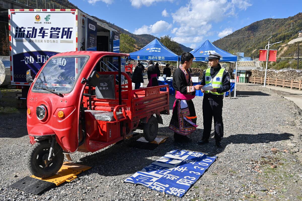 帐篷前的空地上,民警正利用便携式电子称对一辆三轮摩托车进行称重查验。“农村地区有很多这种拉货载物的三轮摩托,就拿白马镇来讲,以前群众上牌要去80公里以外的平武县城里的车管所,来回成本高还耽误时间。许多群众觉得麻烦就不想上牌照了,这也带来了很大的交通安全隐患。”现场办理民警告诉记者,“现在车管服务直通车直接开到村寨里,我们带了便携设备对车辆进行现场查验、受理上户业务,手续资料齐全的情况下,3个工作日内新牌照就能寄递到群众家里。”在家门口就能上牌,如此便利也整体提高了摩托车、电动车的上户率,从源头夯实了道路交通安全基础。