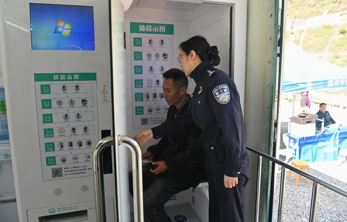 30日中午1时,扒昔加古寨广场上早已热闹起来。车管所民警们带着全套设备抵达现场,分工协作搭建临时办理点:蓝色帐篷稳稳撑起,塑封机、打印机、电脑等设备一字排开,有条不紊地完成调试;服务直通车接驳电源后,车厢内的电子屏随即亮起,滚动播放着通俗易懂的交通安全知识;另一侧,自助体检机成功连接医院和公安业务后台,随时准备为群众提供体检服务。