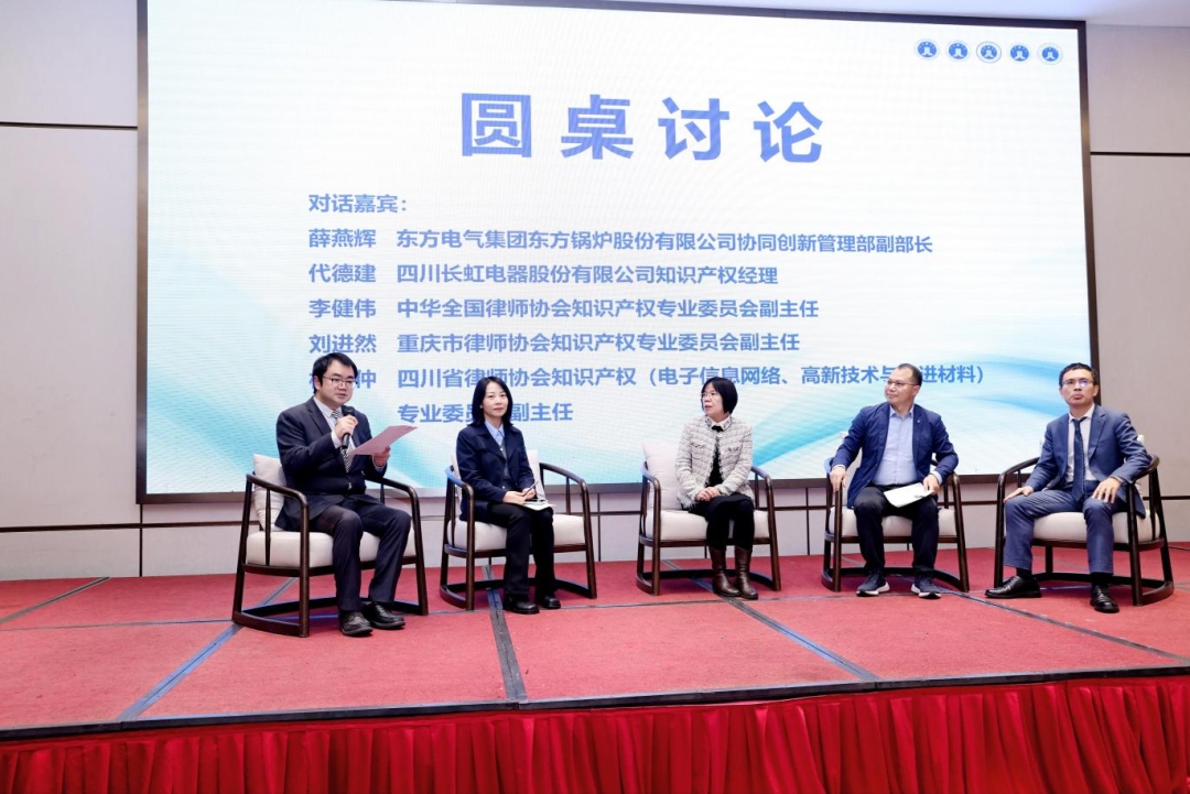 圆桌讨论环节,东方电气集团东方锅炉股份有限公司协同创新管理部副部长薛燕辉、四川长虹电器股份有限公司知识产权经理代德建、全国律协知专委副主任李健伟、重庆律协知专委副主任刘进然、四川律协知专委副主任杜诗仲围绕企业知识产权管理面临的新挑战、提升知识产权法律服务的价值、知识产权法律服务的区域协调发展等问题进行了交流讨论。