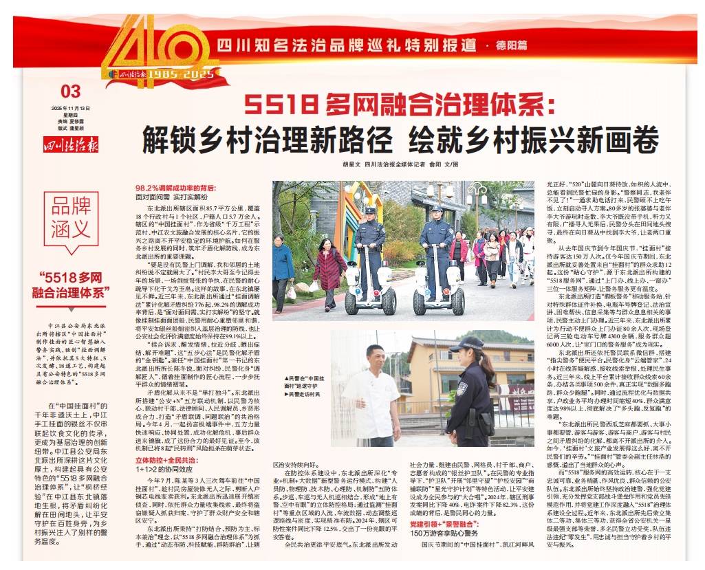 中江县公安局东北派出所将辖区“中国挂面村”制作挂面的匠心智慧融入警务实践,独创“挂面调解法”,并依托其5大特征、5次发酵、18道工艺,构建起具有公安特色的“5518多网融合治理体系”。