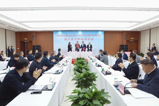 11月14日,省高院天府中央法务区审判法庭项目移交暨座谈活动在成都举行。据悉,新审判法庭预计2026年上半年完成首批搬迁入驻,将成为集公正司法、便民服务、法治宣传研究于一体的现代化司法枢纽和重要法治阵地,为治蜀兴川再上新台阶注入法治动能。省高院党组书记、院长王树江,省委政法委副书记廖全军,省机关事务管理局二级巡视员沈文贵,天府新区管委会主任陈历章及相关单位同志参加活动。