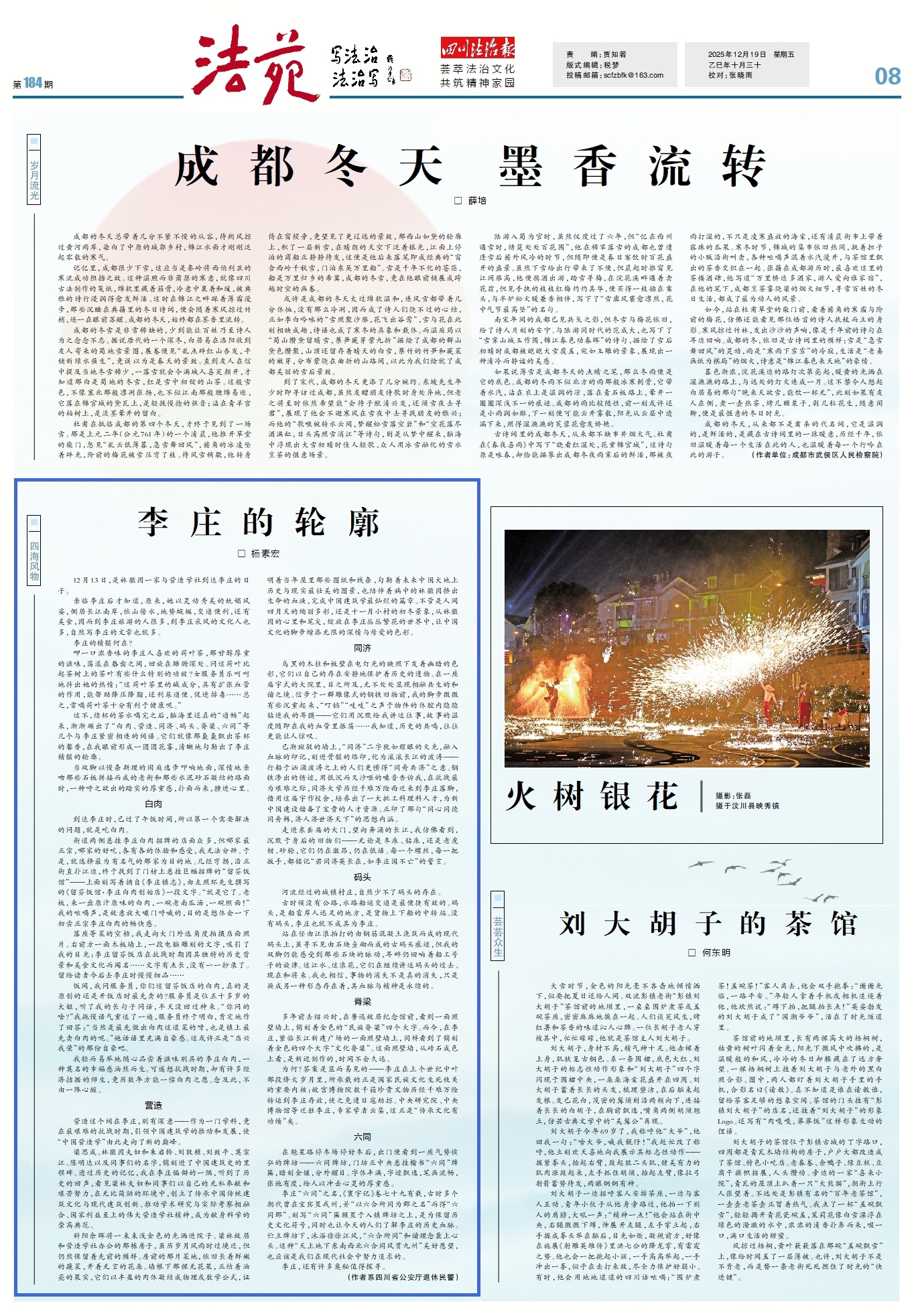 这不,续杯的茶水喝完之后,脑海里还真的“通畅”起来,渐渐蹦出了“白肉、营造、同济、码头、脊梁、六同”等几个与李庄紧密相连的词语。它们就像那袅袅飘出茶杯的馨香,在我眼前形成一团团花雾,清晰地勾勒出了李庄精髓的轮廓。