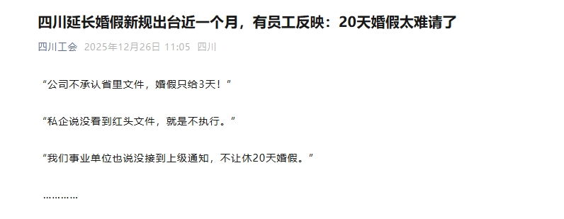 然而,与这份期待形成鲜明对比的,是政策落地过程中传来的现实回音。12月25日,本报报道《四川延长婚假新规出台近一个月,有员工反映:20天婚假太难请了》发布后,迅速引发广泛共鸣。四川省总工会官方微信公众号随即转发报道,并表示下周回应民众关切。