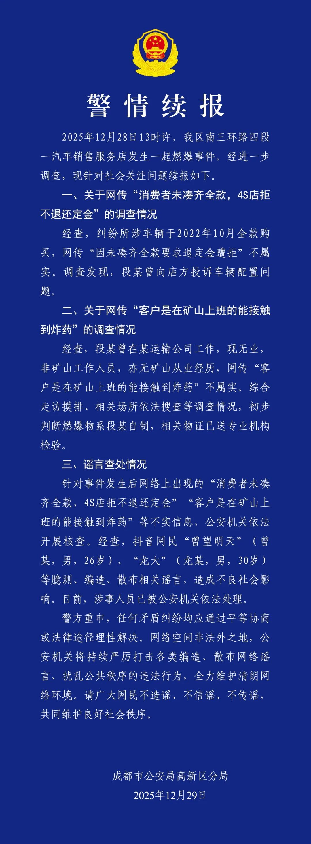 成都高新警方再通报汽车服务店燃爆事件调查情况,查处2名造谣者