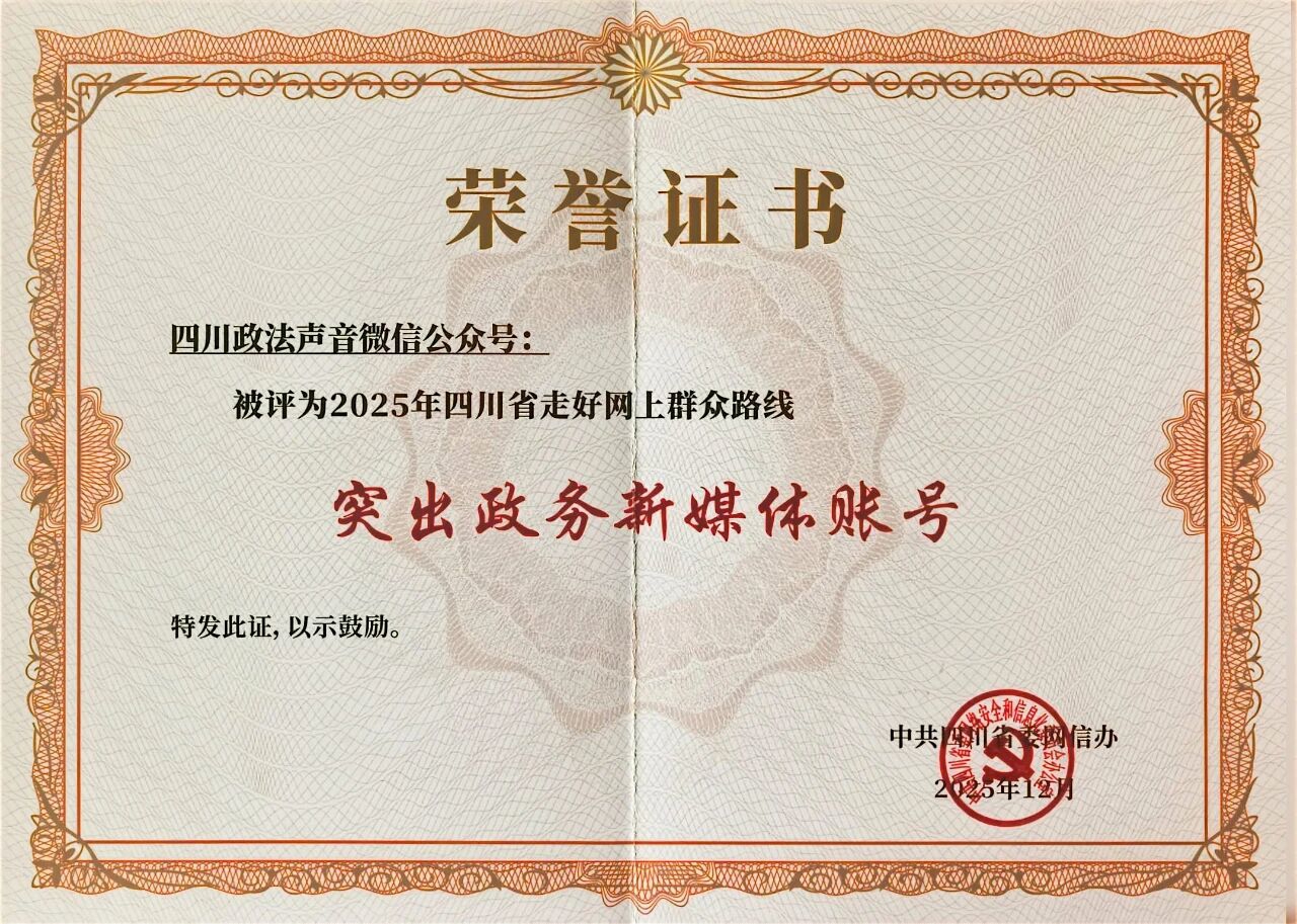 “四川政法声音”微信公众号被评为“2025年四川省走好网上群众路线突出政务新媒体账号”。