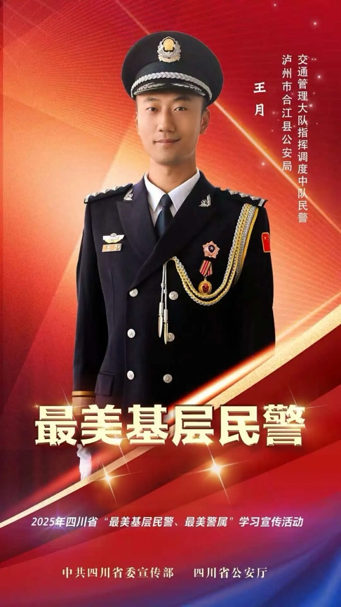 王月,男,33岁,汉族,泸州市公安局合江县局交通管理大队指挥调度中队二级警长,曾荣获个人二等功1次,合江县第三届“敬业奉献道德模范”称号,嘉奖2次,泸州市2022年度政法干警驻网格工作优秀干警。