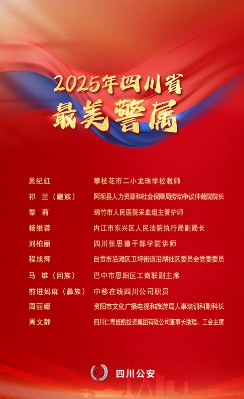 授予攀枝花市二小龙珠学校吴纪红、阿坝县人社局祁兰、绵竹市人民医院黎莉、内江市东兴区人民法院杨维蓉、四川张思德干部学院刘柏丽、自贡市沿滩区沿湖社区程旭辉、巴中市恩阳区工商联马维、中移在线四川公司前进妈麻、资阳市文广旅局周丽娜、四川仁寿旌凯投资集团周文静等10人2025年四川省“最美警属”称号。