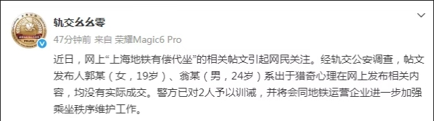 近日,网上“上海地铁有偿代坐”的相关帖文引起网民关注。经轨交公安调查,帖文发布人郭某(女,19岁)、翁某(男,24岁)系出于猎奇心理在网上发布相关内容,均没有实际成交。警方已对2人予以训诫,并将会同地铁运营企业进一步加强乘坐秩序维护工作。