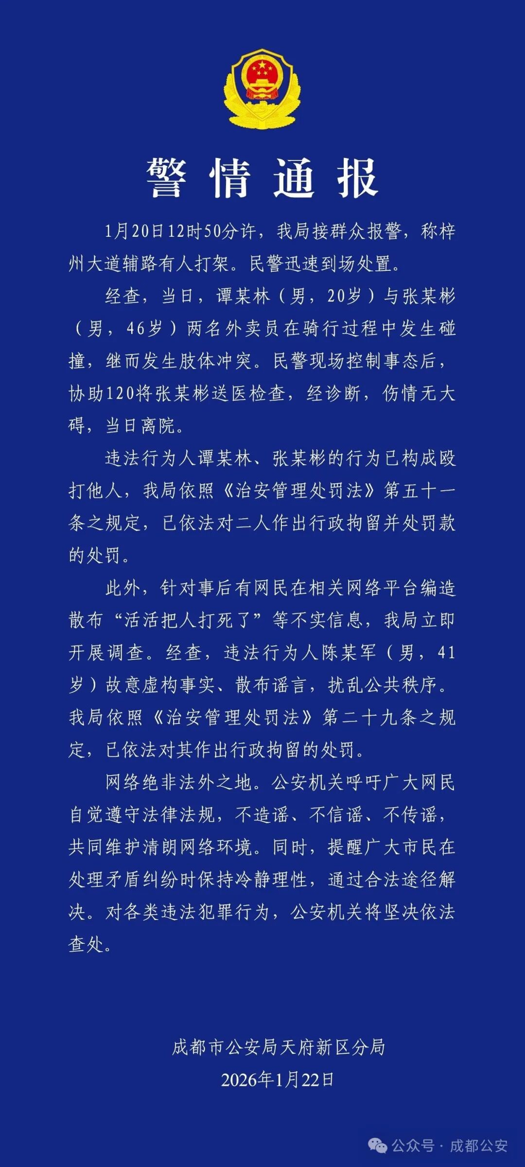 2026年1月22日,成都市公安局天府新区分局发布警情通报:
