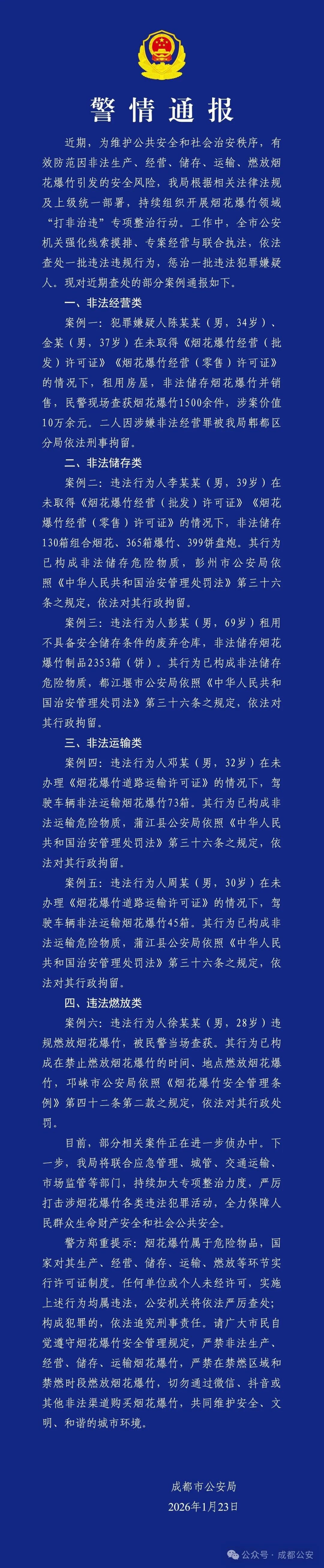 成都警方通报六起涉烟花爆竹典型案例