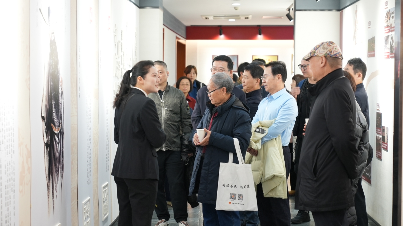 图为采风作家们在包河区人民法院文化活动中心观看展览。