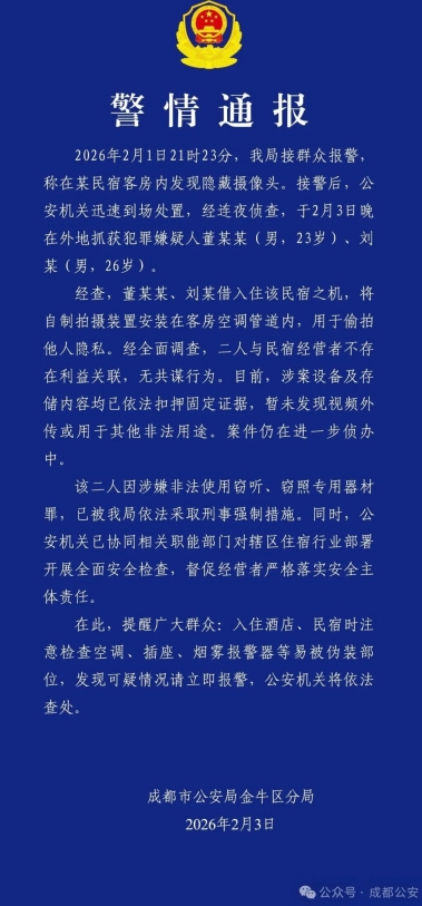 警方连夜侦破民宿偷拍案:二人已落网