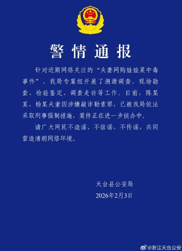 针对近期网络关注的“夫妻网购娃娃菜中毒事件”,我局专案组开展了溯源调查、现场勘查、检验鉴定、调查走访等工作。目前,陈某某、杨某夫妻因涉嫌敲诈勒索罪,已被我局依法采取刑事强制措施,案件正在进一步侦办中。