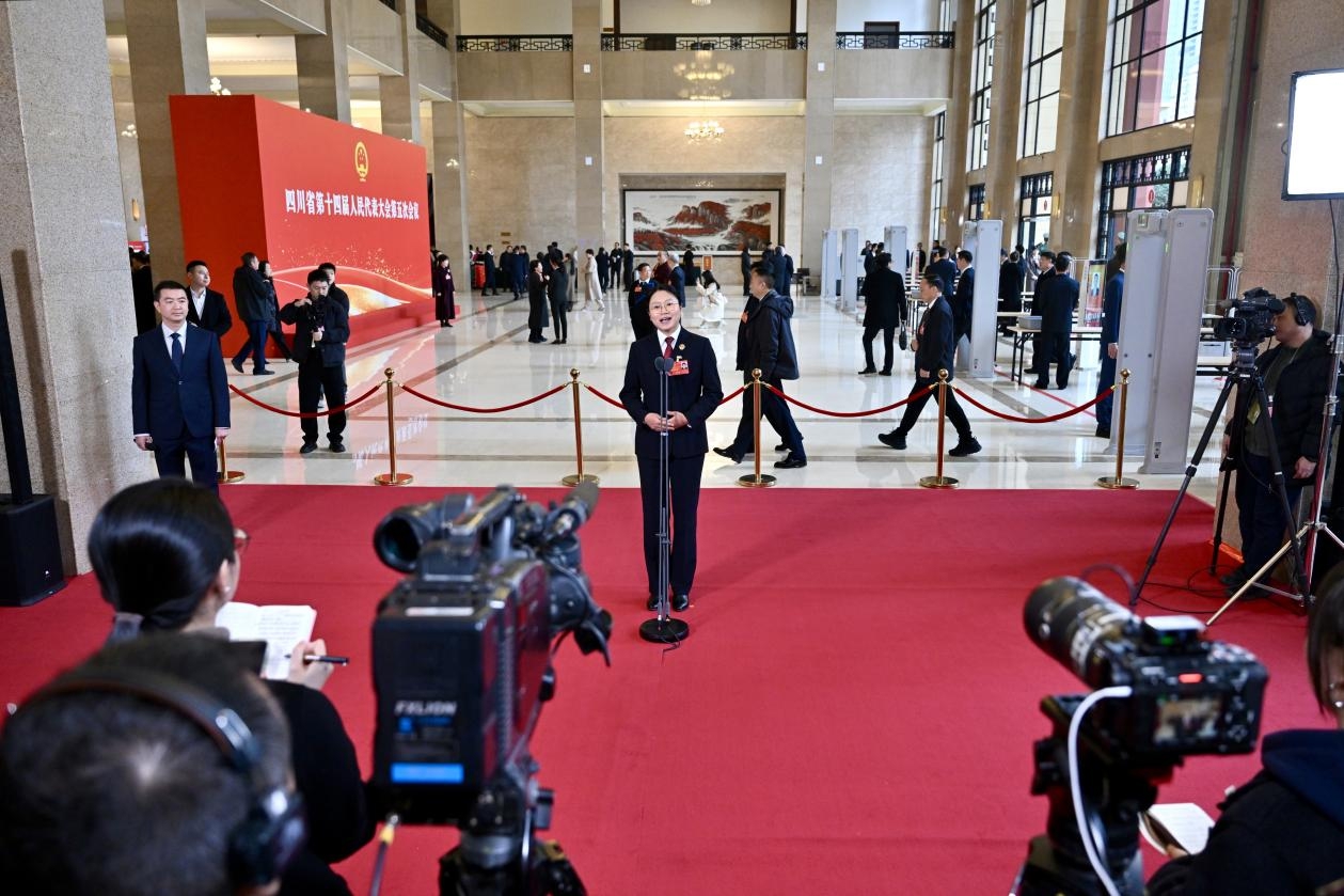 “我是来自资阳市人民检察院的基层人大代表,更是一名从事未成年人保护工作的检察官。”2月7日下午2时26分,四川省十四届人大五次会议第三场“代表通道”上,省人大代表、资阳市人民检察院副检察长尹鹤鸣身姿挺拔、语气温和而坚定。她身着笔挺的藏蓝制服,胸前检徽闪亮,一条红色领带在庄重中透出温暖,展现出一名法律人的专业与温度。