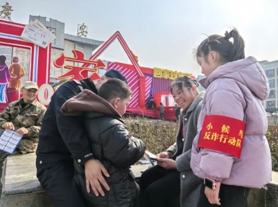 “接到陌生电话,一定要先问警察!”孩子们踮起脚尖,将反诈宣传册递到返乡旅客手中,用清脆响亮的声音普及防骗知识。