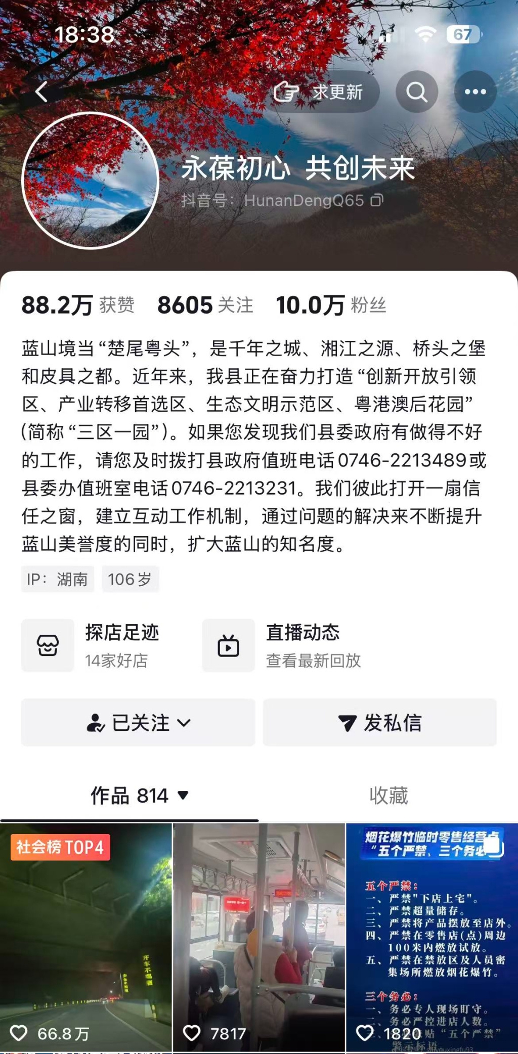 邓群个人账号的简介上还写道,“如果您发现我们政府系统做得不好的工作,请您及时拨打县政府值班电话0746-2213489或县委办值班室电话0746-2213231。我们彼此打开一扇信任之窗,建立互动工作机制,通过问题的解决来不断提升蓝山美誉度的同时,扩大蓝山的知名度。”
