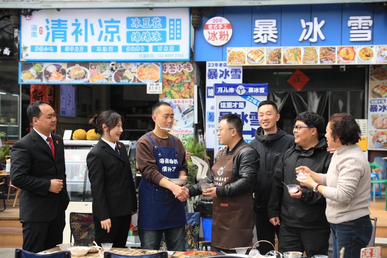 “尝尝我们的白菜卷!”“他们家今天也上新了!”3月10日上午,当成都铁路运输中级法院的法官廖宇羿和崇州市综治中心调解员周文君再次走进崇阳街道的暴冰雪与拾月甜海南清补凉甜品店时,迎接他们的不再是调解室里的沉默与对峙,而是两家店铺其乐融融的邀请。