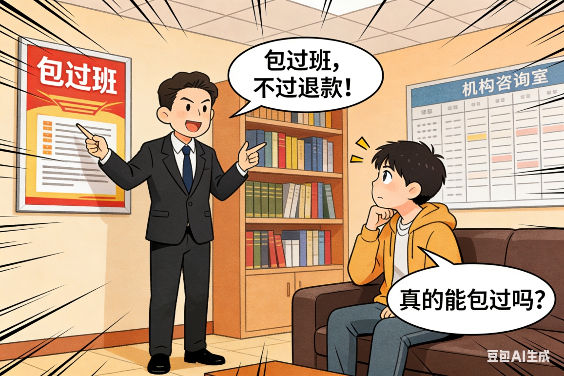 “我们这行,现在谁敢直接喊‘包过’?”该老师压低声音说,“但我们签协议,有‘不过退费’机制,你可以理解成就是‘包过’。”