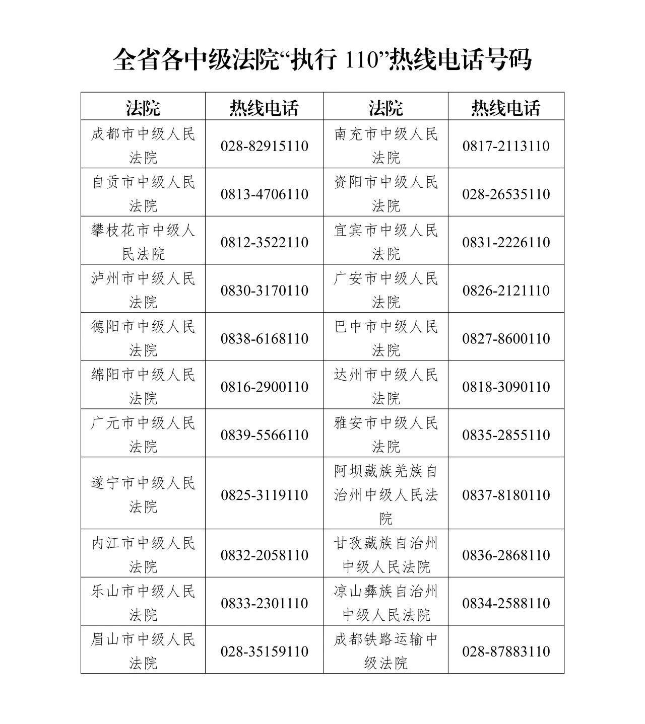 对于情况紧急,需要立即出警处置的财产线索,请直接拨打“执行110”热线(全省各中级法院“执行110”热线电话号码附后)。