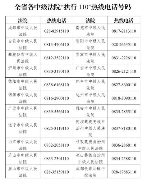 据悉,执行案件当事人、人民群众可拨打12368热线提供被执行人财产线索,通过热线反映线索后,需及时向执行法院补交书面材料。材料应包括财产名称、类型、位置、权属等具体信息,并附上相关证明材料。省法院同时提示,对于情况紧急,需要立即出警处置的财产线索,可直接拨打“执行110”热线。全省各中级法院“执行110”热线电话号码如下: