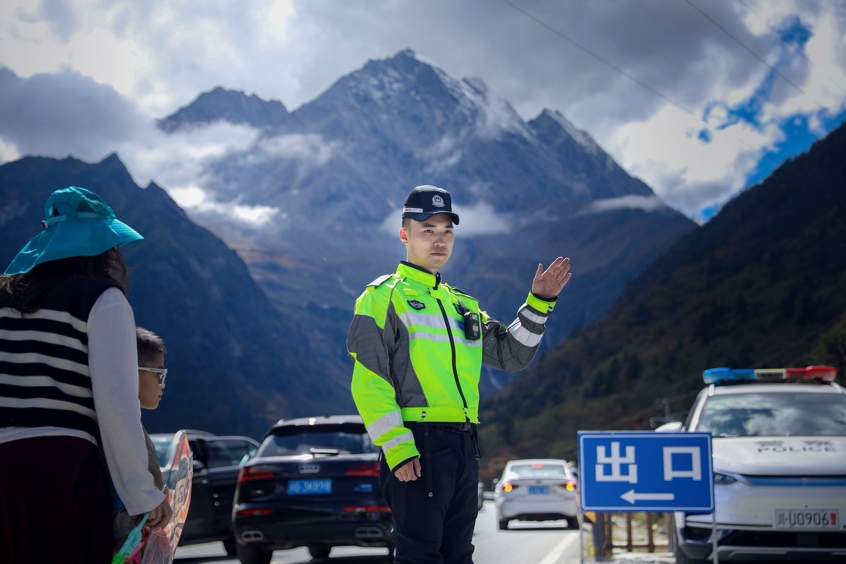 在毕棚沟景区停车点,执勤交警杨玥一边擦去额头的汗水,一边耐心为游客讲解周边游玩路线。短短十分钟,她回答了七八位游客的询问——从“哪里能拍到雪山倒影”到“哪里有医务室”,这些问题她都对答如流。