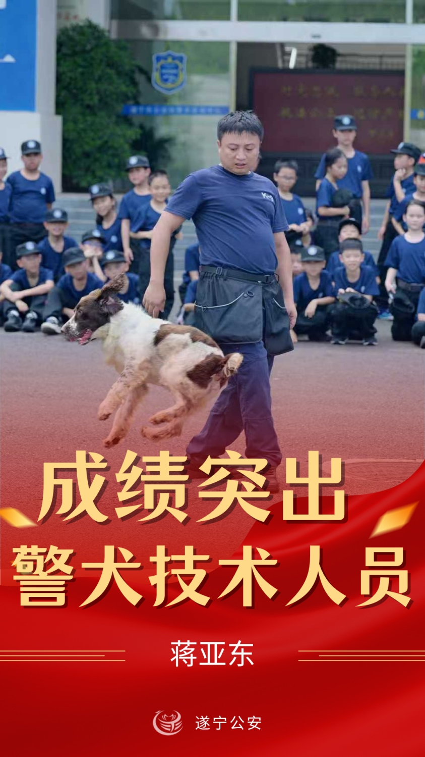 遂宁市公安局刑侦支队金磊、射洪市公安局兰波、蓬溪县公安局蒋亚东、大英县公安局罗强被评为“成绩突出警犬技术人员”