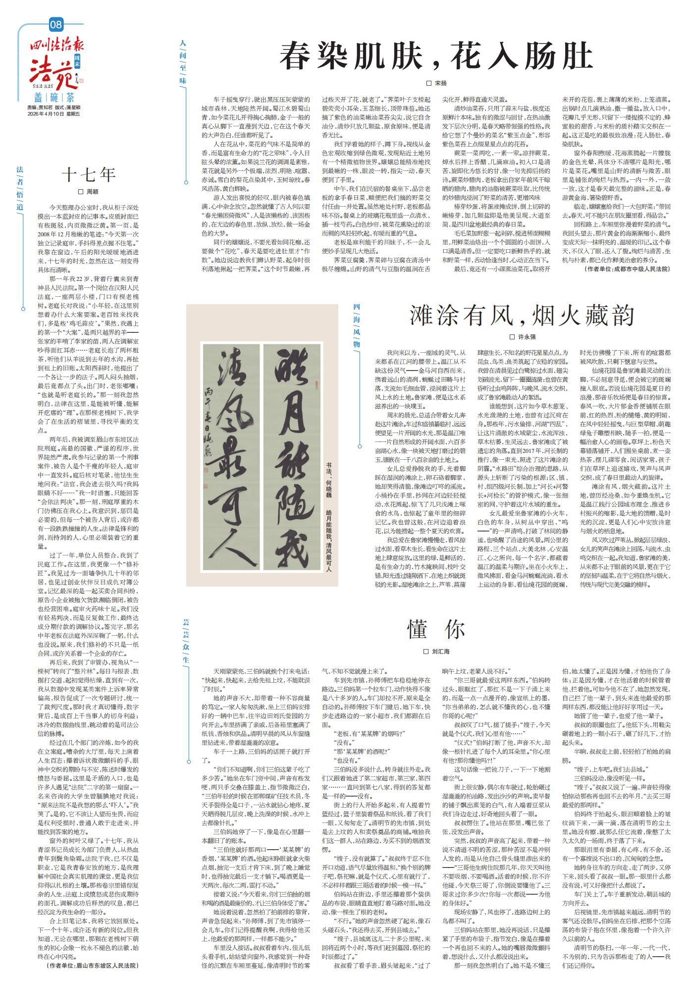 窗外的树叶又绿了。十七年,我从青涩书记员成长为部门负责人,从热血青年到鬓角染霜。法院于我,已不仅是职业,它是我青春安放的地方,是我理解中国社会真实肌理的课堂,更是我信仰得以扎根的土壤。那些卷宗里错综复杂的人生,法庭上或愤怒或悲伤或期待的面孔,调解成功后释然的叹息,都已经沉淀为我生命的一部分。