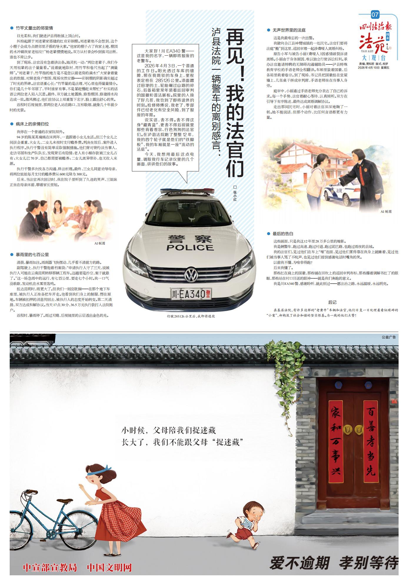说实话,舍不得。舍不得这身“藏青蓝”,更舍不得后视镜里那些背着卷宗、行色匆匆的法官们。在泸县法院跑了整整12年,我的四个轮子就是他们的“铁脚板”,我的车厢就是一座“流动的法庭” 。