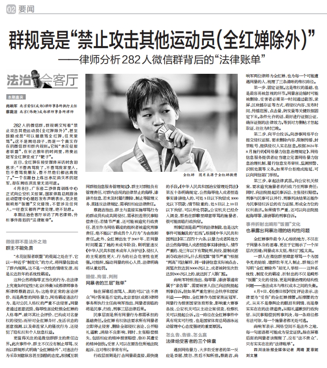 蔡蕤洁指出,群主与直接实施辱骂行为的群成员构成共同侵权,需承担连带民事赔偿责任;若情节严重,还可能被追究行政责任,甚至作为网络霸凌的组织者被追究刑事责任,绝不能以“群成员个人行为”为由推卸责任。此外,全红婵出生于2007年,若网暴时间覆盖了她的未成年阶段,则明显违反《中华人民共和国未成年人保护法》,侵权人的主观恶性更大,行为的社会危害性也更强。对组织、煽动网暴的核心人员,法律明确将从重处罚。