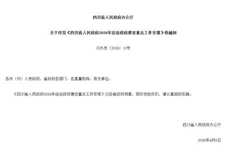 近日,四川省人民政府办公厅正式印发《四川省人民政府2026年法治政府建设重点工作安排》(以下简称《工作安排》),明确了加强法治政府建设工作统筹、严格落实重大行政决策程序规定、提升政府立法工作质量、改进优化政府职能、全面规范行政执法、依法化解行政争议和矛盾纠纷、推进社会依法治理、加强数字法治政府建设、强化人才队伍建设等9方面17项工作,着力解决依法行政突出问题,进一步提升依法行政能力和水平。