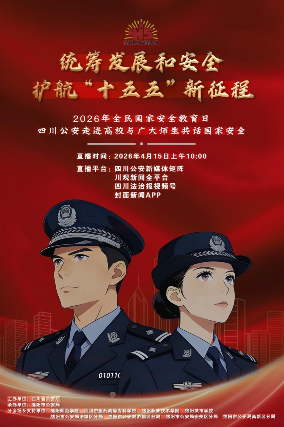 2026 年全民国家安全教育日四川公安高校行直播开启!本次直播以 “统筹发展和安全,护航‘十五五’新征程” 为主题,4 月 15 日 10:00—12:00 走进绵阳师范学院、四川中医药高等专科学校、绵阳职业技术学院、绵阳城市学院四大高校。直播将沉浸式展示校园警务服务、反恐装备体验、国家安全知识互动、主题班会、手绘海报展等特色环节,更有民警与师生现场分享交流。锁定锁定四川公安、四川法治报视频号,共学国家安全知识,筑牢青春安全防线!