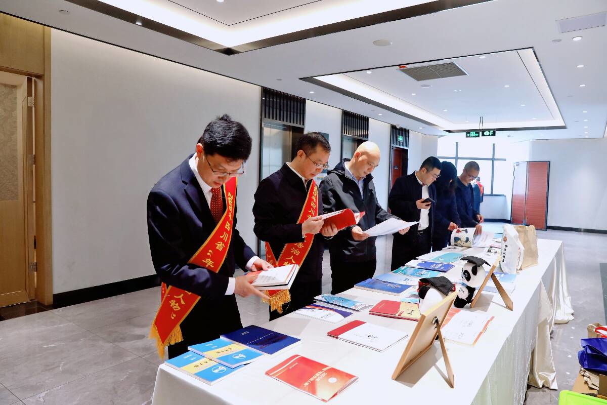 宣讲前的展台前,法治书籍和文创产品整齐铺开。有人低头翻看汉彝双语的普法读本,有人举起手机拍下《法治三画》,并凑近端详。几位身着制服的观众围在《四川省中华优秀传统法律文化名录(人物篇)》前,你一言我一语地低声讨论着。