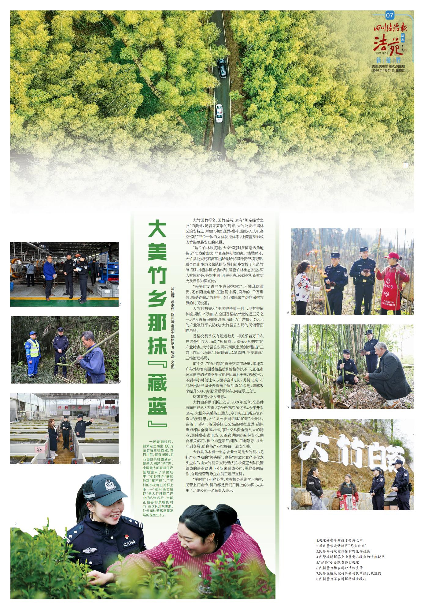 大竹因竹得名,因竹而兴,素有“川东绿竹之乡”的美誉。随着采笋季的到来,大竹公安根据林区治安特点,构建“地面巡逻+警车巡线+无人机高空巡航”三位一体的立体防控体系,让藏蓝身影成为竹海里最安心的风景。