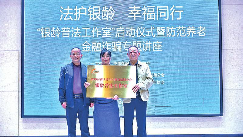 活动中,成都高新区老年人协会会长孙波为“工作室”授牌。孙波表示,该协会将全力支持“工作室”的建设和发展,充分整合各方资源,着力加强统筹协调,推动普法服务常态化、长效化,争取在试点成功的基础上向全区推广,真正把法治关怀送到成都高新区每一位老年朋友的身边。