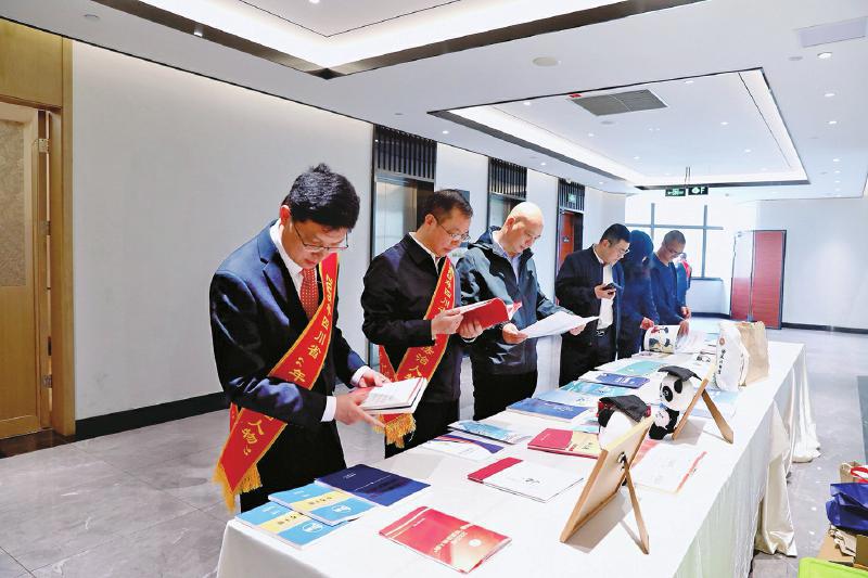 2025年四川省“年度法治人物”和与会观众在展台前翻看法治书籍